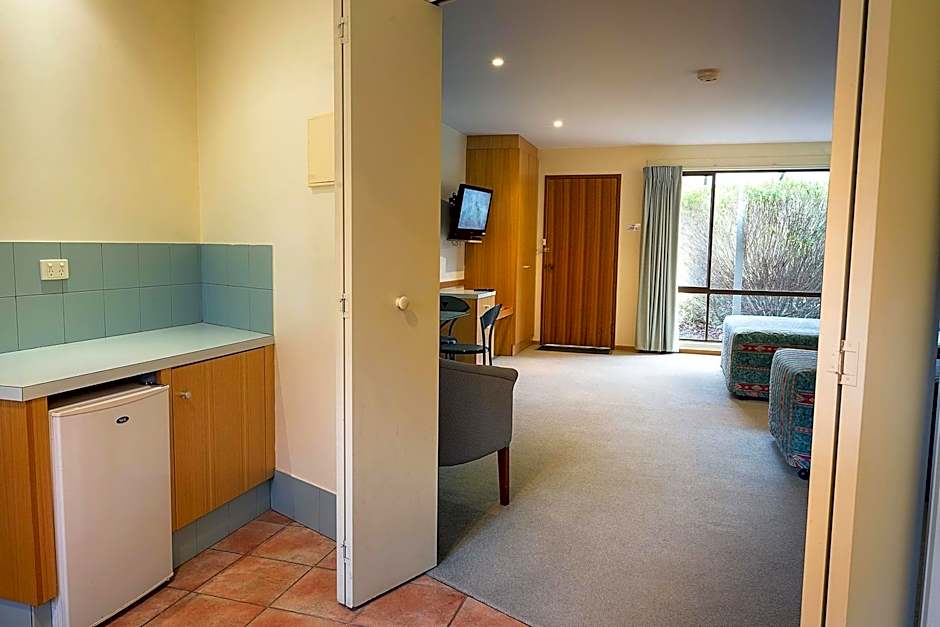 This King Room features a separate lounge / kitchenette with a microwave, electric fry pan, toaster, kettle, fridge, sink and kitchenware. Linen and bath towels are provided. Pool towels can be hired from Reception or you can bring your own. There is a King bed in the separate bedroom and a wheelchair accessible shower.